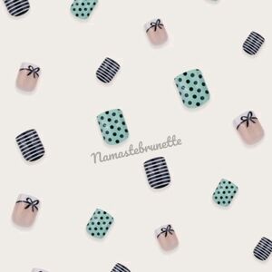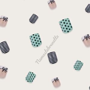 Short Nails | Boho | Polka-dot Pattern Nails | Square Nails | Fake Nails | False Nails | Press Ons | Summer Spring Manicure | Black | Boho Wedding Mani | Beach Resort Nails | Stripes | Bow French Manicure | White | Mint Green |