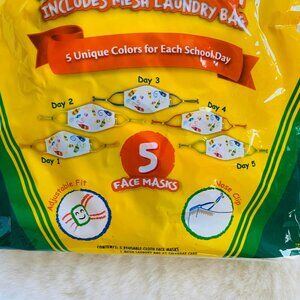 The Crayola Kids Reusable Cloth Face Mask 5-pack Set in multiple colors is designed for kids. This adjustable face mask set, suitable for both boys and girls, features a fun Crayola brand design. With sizes ranging from S to M, kids can ensure a comfortable fit while keeping up with the latest safety measures. Set includes 5 face masks for each day of the school week, a mesh laundry bag, and a calendar card.