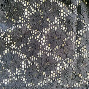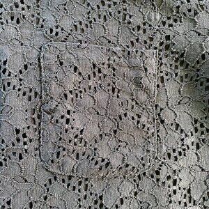 Features black floral-patterned lace in the front and on the sleeves, solid black back, and one front breast pocket.