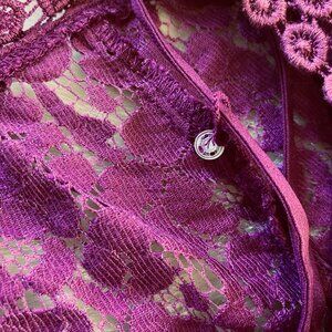 This beautiful purple floral lace top by Nicole Miller is perfect for those who love feminine and bohemian styles. With short, subtle bell sleeves, and a V-neckline, it features crochet trim at the collar and cuffs. The tunic style top is lined with an adjustable strap camisole that also has button strap fasteners at the inside lining of the shoulders to keep the camisole in place. It is suitable for wearing in both summer and spring and is perfect for any occasion that calls for a pretty and feminine touch to your outfit.