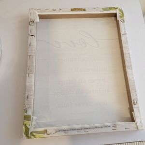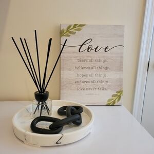 Love never fails Canvas with Bible verse. Rustic modern farmhouse design with wood background. Black, light gray and tan colors. Great for hanging on a wall or using on a table display. Has a hook on the back. No visible flaws or stains.