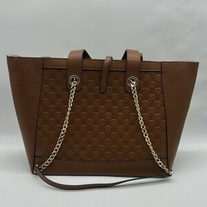 Elegant brown leather tote bag with chain accents. Perfect for everyday use.