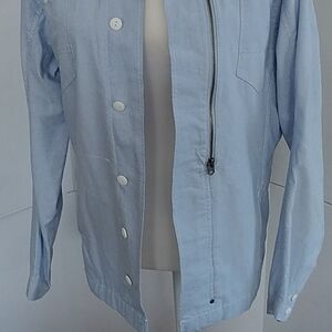 21Men Los Angeles light blue SP Shirt/Jacket, Button down front. Decorative zippers on collar and front. Military style shoulders. Lots of details going on in this well made high quality cotton shirt. Unisex I believe. Excellent condition. Beautifully made.