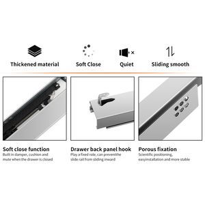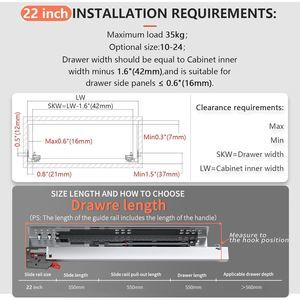 22" Bottom Mount Soft Close Drawer Slides Full Extension Concealed Rails Track 80 lb Load Capacity 1 Pair (22 inch) Color White Material Alloy Steel Brand SIGOEI Mounting Type Under Mount Anti rust and ant corrosion:drawer slides are treated with electroplated blue zinc plating,The electroplated layer can prevent direct contact between the air and the track steel plate, thereby resisting oxidation and corrosion Soft-Close: featuring soft-close functionality to ensure the drawer close softly and silently. High quality, long service life: Made of thick steel plate, high density, high strength, load-bearing capacity up to 35kg/80lb, slide opening and closing test 100,000+ times. which is durable and the normal service life of the slide rail exceeds 30 years Long warranty: The warranty period of the slide rail is 1 year. You can contact us at any time to solve different quality problems or usage problems . Rear mounting bracket not supported, If the received products are missing parts, please contact us for replacement Hidden bottom installation: Make your drawer making it cleaner and more beautiful, the slides hide away with ease, Mounting screws included.
