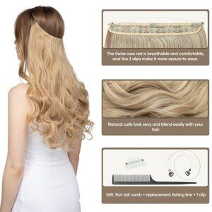 22 Inch Invisible Wire Hair Extensions, Wavy Curly Ash Brown/Blonde with 3 Clips