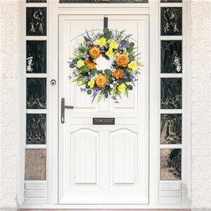 【Gorgeous Materials for Front Door Wreath】Hey there! Our front door wreath is a fluffy and vibrant beauty. It features a variety of elements: different-sized orange peonies that burst with color, soft light yellow gardenias, calming purple lavender, and fresh eucalyptus leaves, all anchored on a thick grapevine base. And it's loaded with flowers inside and out, making it truly lush and eye-catching