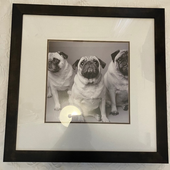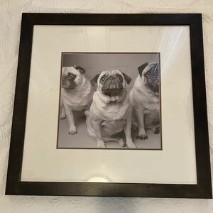 Three pug photo showcased in a beautiful dark brown frame measuring 22.5” x 22.5”. Adorable pugs on display for any pet owner.