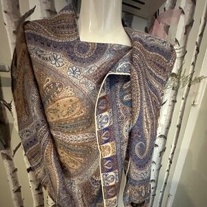 THIS SCARF OR WRAP HAS BEAUTIFUL COLORS MAKING IT WEARABLE WITH MANY OUTFITS, THE SOFT BLUES, BEIGES, LIGHT TAN AND OFF WHITE WITH A SEWN IN RING TO PULL THRU SO YOU CAN STATION THIS WRAP THE WAY YOU WANT IT TO LOOK