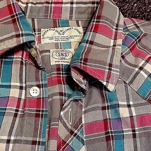 Second pic shows color better. Hardly ever wore this. Super bad shirt brand xs colors pink, blue, gray, burgundy, black & white.