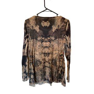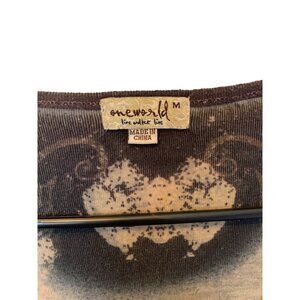 This One World Live & Let Live size M Brown Pattern Long Sleeve Blouse features a jeweled neckline, boho-inspired styling, and a comfortably loose fit.