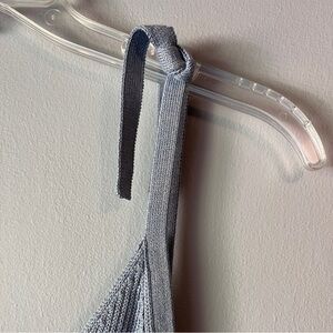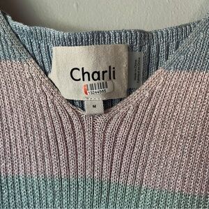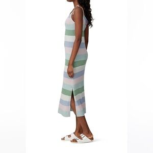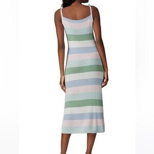 Charli pastel stripe Leora knit midi sheath dress with left side slit and tie straps. Length is mid-calf. Lovely knit material with metallic sheen. Comfortable and stretchy. As featured on Rent the Runway!
