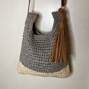 Grey & Cream Colorblock Straw Crossbody w/Tassel Accent