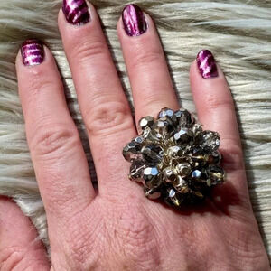 This fun ring is in excellent gently used condition. The silver on the stretch band does show slight signs of tarnish which might be able to be cleaned up, but the fun top is still gorgeous! Even better in person!