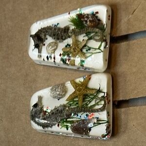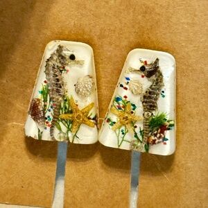 Vintage seahorse, underwater clip on earrings w/shells, starfish & kelp. Possibly Lucite, resin or enamel. Clips look brass, work great & snap tight. Estate piece.