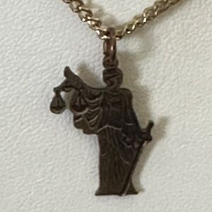 2/$20 Lady Justice, gold tone pendant & chain. 18” long. Lobster clasp.