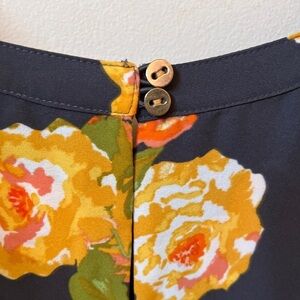 Charcoal Floral Pleated Blouse Like new! Beautiful orange and and yellow florals stand out against a charcoal backdrop. Boatneck, pleated flare sleeves with button closure and lovely gold buttons at the back.