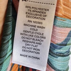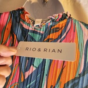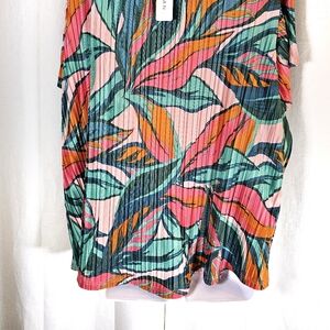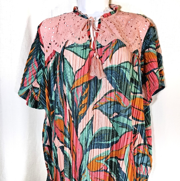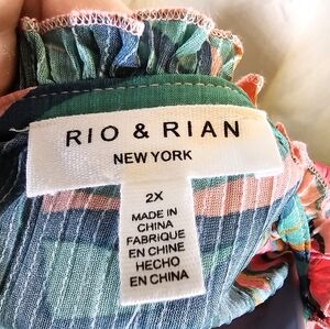 New with tag Rio & Rian sz 2X, beautiful upper pink eyelet ruffled edged trim tie tassel neckline pink green/pink/orange tropical print top. Has some sheen in material! Textured print! Vibrant colors! Wear with a skirt, pants or anything! Rommy fit! 64" around chest, 28.5" in length. $15 or 2/$20 (2 select items, not 2 of 1 item!)