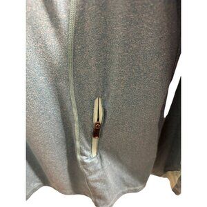 This Road Runner Two Tones Turquoise Athletic Pullover in size L is designed for maximum comfort and functionality. The pullover features thumb holes, a back pocket, a headphone cord holder, and reflective safety elements. It's made from a blend of polyester and spandex for a fitted style.