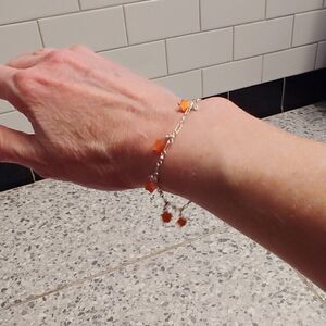 Cute bracelet with little orange shell stars and a silver bell that jingles. Measures about 8" long. Standard clasp. New. Never worn. Purchased years ago from professional silver dealers Blake Brothers.