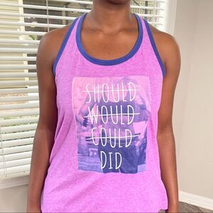 Athletic Works racerback tank Inspirational reads Should Would Could all crossed out and the word Did Purple and navy, loose fit, poly/cotton blend