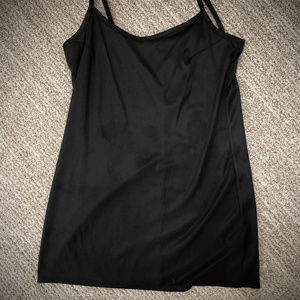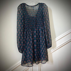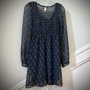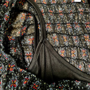 EUC! Flowy dress has a printed chiffon body with a separate black slip layer underneath. Secures to dress at shoulders with thread loops. Shirred and slightly stretchy bodice w/gathered elastic neckline and sleeves. Waist stretches from 12"-20". Approx 32" shoulder to hem. Slip is stretchy material, measures 16" pit to pit.