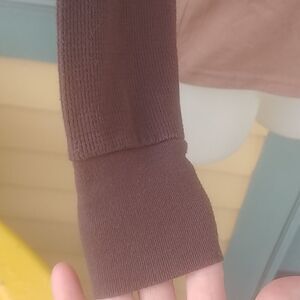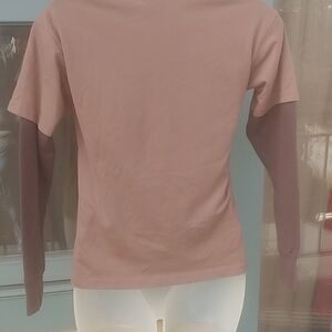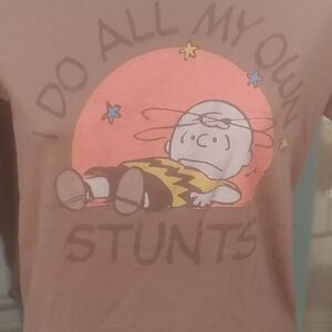 Cute Charlie Brown t-shirt "I do all my own stunts." Two-toned, light brown background, darker brown waffle knit sleeves gives illusion of layered shirts. 50% cotton, 50% polyester blend. Measurements laid flat: 17" pit to pit, 20" shoulder to cuff, 22" shoulder to waist, 15" waist. Very good used condition. No stains, tears or holes.
