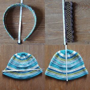 Start your summer headwear collection with this fun set of hippie hair accessories. The hat is woven polyester in striped hues of blue, green and white with three rows of iridescent sequins. The green Guatemalan ribbon headband is a quintessential hippie accessory.   Then there's the crocheted brown beaded headband for the trifecta of summer concertwear. All in good condition.