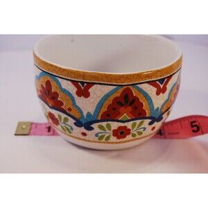 Enhance your dining experience with the vibrant and festive 222 Fifth El Centro Finger Bowls. This set of three ceramic bowls is perfect for any occasion, bringing a splash of color to your table. Each piece showcases an abstract, arts & crafts/mission style pattern with a cheerful, multicolored design that is sure to stimulate the senses and elevate your hosting. The bowls measure 6 inches in width and stand 3 3/8 inches tall, ideally sized for a variety of uses from dipping sauces to serving snacks. Whether you're entertaining guests or enjoying a family meal, these round finger bowls from the well-regarded 222 Fifth brand are a delightful addition to your serveware collection.