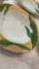 These tropical and lush bowls feature a white center and a basketweave pattern on the rim, with green foliage flowing along the rim into the center of the bowl. They are in good vintage condition with no chips or cracks. Additionally, they are both microwave and dishwasher-safe.