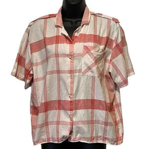 🍀2/$22 Vintage 80s Red White Plaid Short Sleeve Button Down Blouse Womens Medium