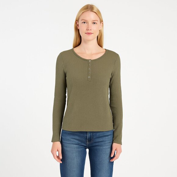 long sleeve top, henley shirt, button-front tee, olive green, army green, khaki, waffle knit, thermal texture, cotton blend, soft knit, casual fit, relaxed silhouette, everyday wear, loungewear, fall winter, cozy style, minimalist, versatile, laid-back, classic casual, timeless, effortless, modern basics