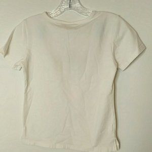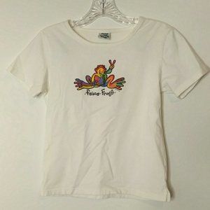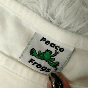 White Shirt with Sparkle Rainbow Peace Frog Logo. Very good condition. Thick quality fabric and soft. Cotton Blend.