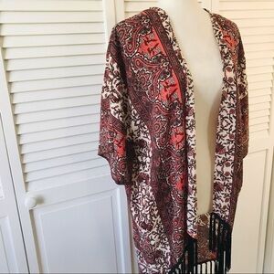 Details: Short sleeve open front lightweight kimono with fringe at the bottom