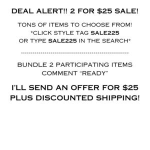 DEAL ALERT! Check out this awesome SALE! BUNDLE THIS ITEM WITH ANOTHER 2/$25 ITEM IN MY CLOSET, COMMENT “READY” AND I’LL SEND $25 OFFER WITH DISCOUNTED SHIPPING!!! There are tons of participating items to choose from! To find these items, type SALE225 in the search bar on Poshmark or click the SALE225 style tag on this inventory