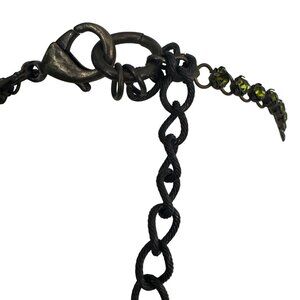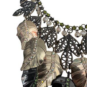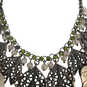 Elevate your style with this alluring 11-inch vintage necklace, which boasts intricate silver and gold leaf designs adorned with shimmering clear, vibrant green rhinestones and beads. A statement piece that draws attention to your neckline, it adds a touch of elegance and sophistication to any ensemble. This is a beautiful vintage piece that exhibits personality and style. Stunning! Like new condition.