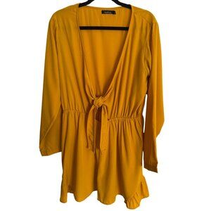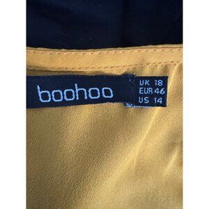 This Boohoo size 14 jumpsuit is made from polyester and features a one-piece design in vibrant, deep mustard yellow. It has long sleeves, a comfortable elastic waist, and a tie at the front.