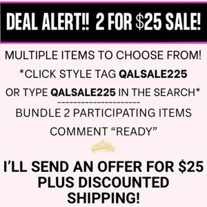 DEAL ALERT! Check out this awesome SALE! BUNDLE THIS ITEM WITH ANOTHER 2/$25 ITEM IN MY CLOSET, COMMENT "READY" AND I'LL SEND $25 OFFER WITH DISCOUNTED SHIPPING! There are MULTIPLE participating items to choose from. To find these items, type QALSALE225 in the search bar on Poshmark or click the QALSALE225 style tag on this listing!