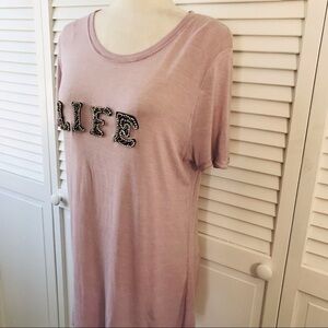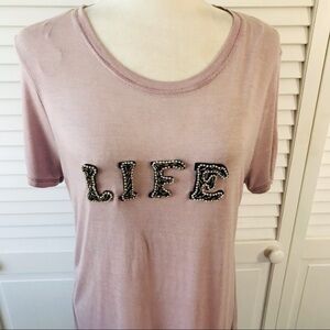 Details: 100% Rayon short sleeve scoop neck sheer shirt with jeweled LIFE written across the front