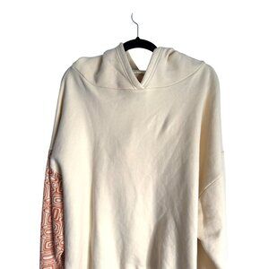 This quality Soley NWOT size small/medium oversized hoodie combines a unique design with comfort. It features a cream body and an orange-patterned sleeve. Made from a soft cotton blend, it ensures a cozy fit.
