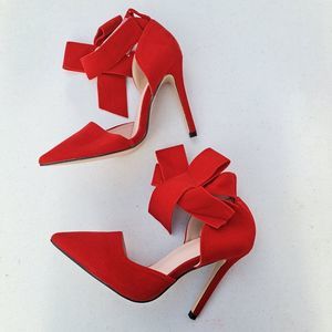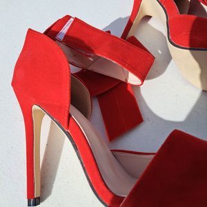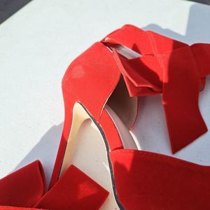 Add some royal elegance to your next formal occasion with these red velvety suede pumps. The pointed toe and very high stiletto heel provide a chic and sophisticated look, while the ankle strap with a bow accent adds a touch of feminine charm. These shoes are perfect for weddings, parties, christenings, or any other festive event.