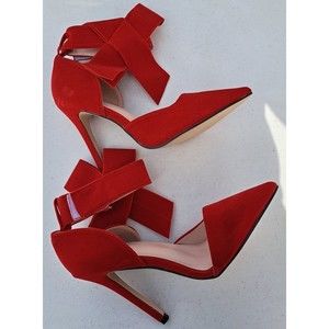 2/$25 Red Velvety suede Bow Ankle Strap 5 inch Pump Heel Stelittoe Size 7.5 EU38