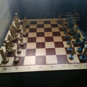 Walnut and sycamore22.5" chess board n custom hand painted pieces./ancient roman pieces 41/2 " tall.