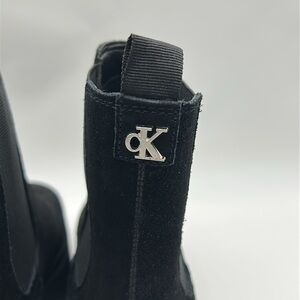 Step into timeless style with these Calvin Klein Jeans suede ankle boots in size 7. These sleek black boots feature a soft suede upper, comfortable low block heel, and side zip for easy wear. Perfect for elevating your everyday or casual chic looks.