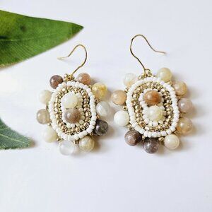 Handmade beaded bohemian earrings in white and gold glass beads surrounding. chunky peach and grey marble stone beads.