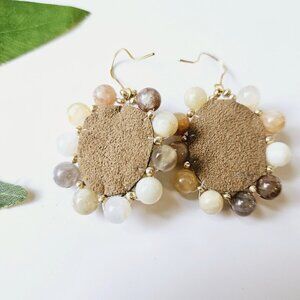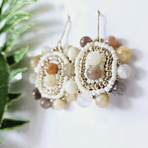 Handmade beaded bohemian earrings in white and gold glass beads surrounding. chunky peach and grey marble stone beads.