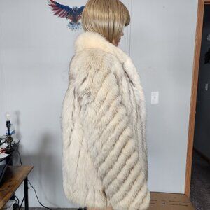 Saga Fox fox fur coat, lapel collar, spiral sleeves, hook and eye closure, 2 pockets size tag states medium but by measurements SMALLL. Measurements are arm pit to pit 20", shoulders 18", sleeves 24" and length 27".