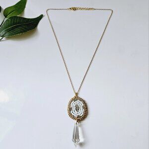 Handmade beaded bohemian necklace in white, clear and gold glass beads falling into elegant crystal shaped clear dangle.