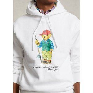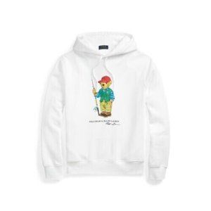 Large features a drawstring closure and a hooded design, perfect for those chilly fishing trips. The white fishing bear design adds a unique touch to this fish-themed hoodie, which is part of the Ralph Lauren Polo Bear product line. Made with high-quality fleece fabric and designed by the prestigious Polo brand, this hoodie is sure to keep you warm and stylish.