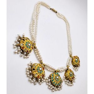 18 kt Gold Pearl Necklace with diamond and Precious Gemstones , Turquise , Coral , Ruby , Sapphire . Gross Weight 121.400 Gms