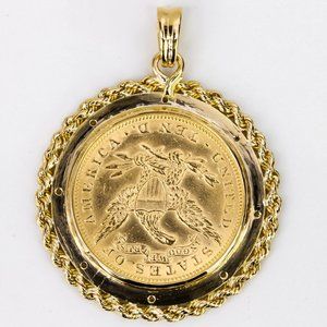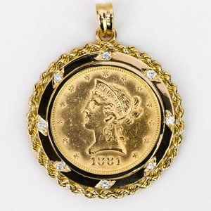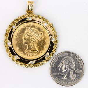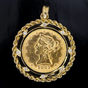 22k Yellow Gold 1881 Ten Dollar US Eagle Coin Diamond w/ 14K Rope Bezel Pendant